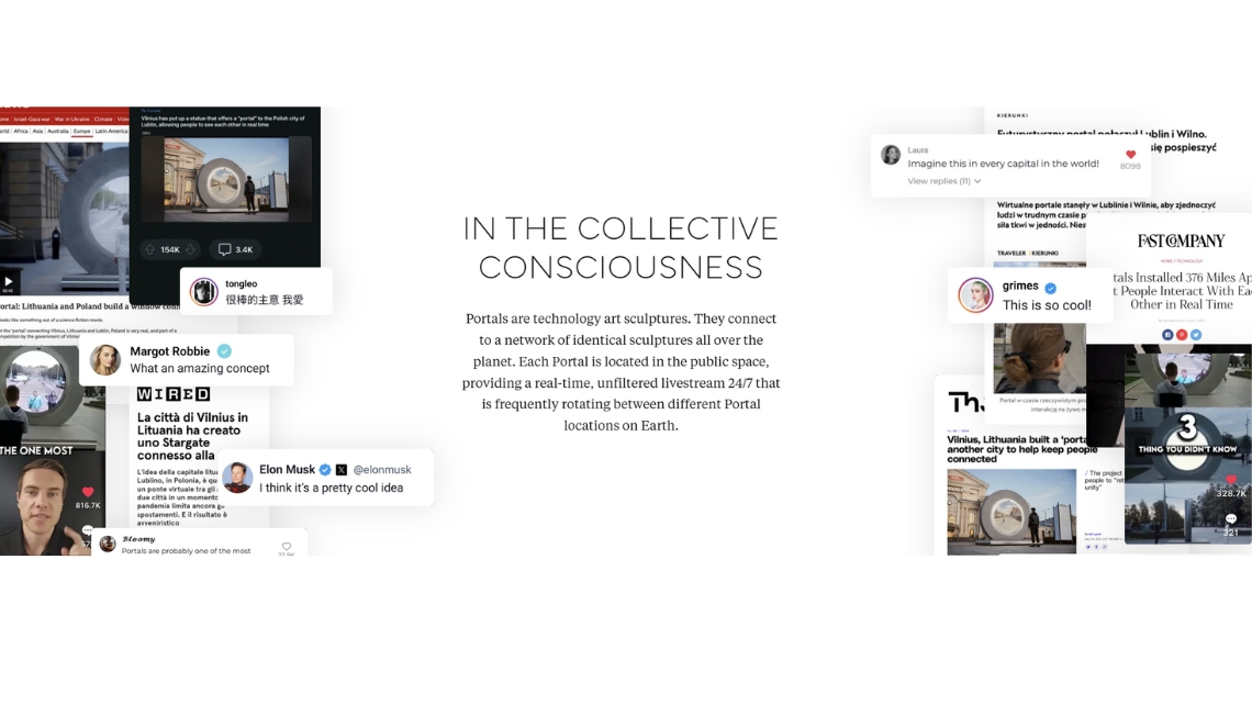 Portals are technology art sculptures. they connect to a network of identical sculptures all over the planet. each portal is located in the public space, providing a real-time, unfiltered livestream 24/7 that is frequently rotating between different portal locations on earth.